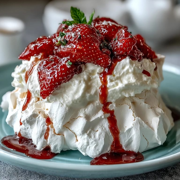 The magic of pavlova lies in the transformation of humble egg whites into cloud-like nests with golden-kissed edges. The secret ingredients—cornstarch and vinegar—work together to create that signature marshmallow center while maintaining the crisp shell. Fresh strawberries macerated with sugar and lemon juice add a bright, juicy contrast to the sweet meringue and rich cream, making each bite a perfect harmony of flavors.